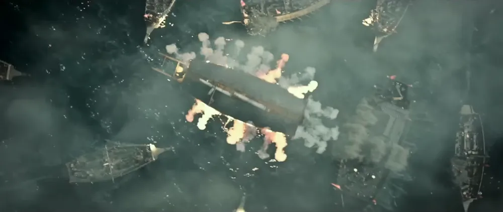 바다를 가르며 날아드는 화살, 날카로운 화포의 굉음, 전열을 갖춘 판옥선들이 만든 물결은 전장을 압도하며 전투의 향방을 조선 쪽으로 서서히 기울게 합니다. 일본군은 조선 수군의 정밀한 포격과 압도적인 협공에 속수무책으로 당하고, 와키자카 역시 혼란에 빠지며 후퇴를 고민하게 됩니다.